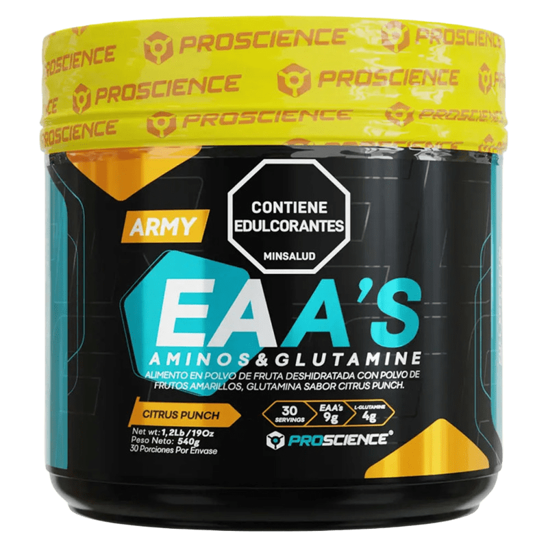 Army EAA Proscience es una mezcla de 9 gramos de EAA (aminoácidos esenciales) y 4 gramos de glutamina. La sinergia de estos tres ingredientes te ayudan a mejora la síntesis de proteína, mejorar la recuperación, retrasar la sensación de fatiga, disminuir los dolores musculares post entrenamiento y fortalecer tu sistema inmunológico