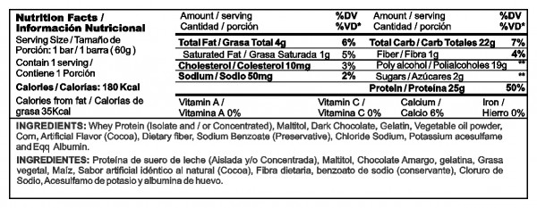 Fit Bar, es una deliciosa e irresistible barra de proteína de suero de leche con una formula revolucionaria y novedosa, que te ayuda a cumplir con tus objetivos de una manera saludable el cual aporta 25 g de proteína de suero de leche por barra, contiene carbohidratos de bajo impacto insulinico para mejorar la sensación de saciedad y control de ansiedad y lo mejor de todo no contiene azúcar añadida, lo que la hace perfecta para cualquier persona que quiera controlar su ingesta de calorías y distribución de macronutrientes.