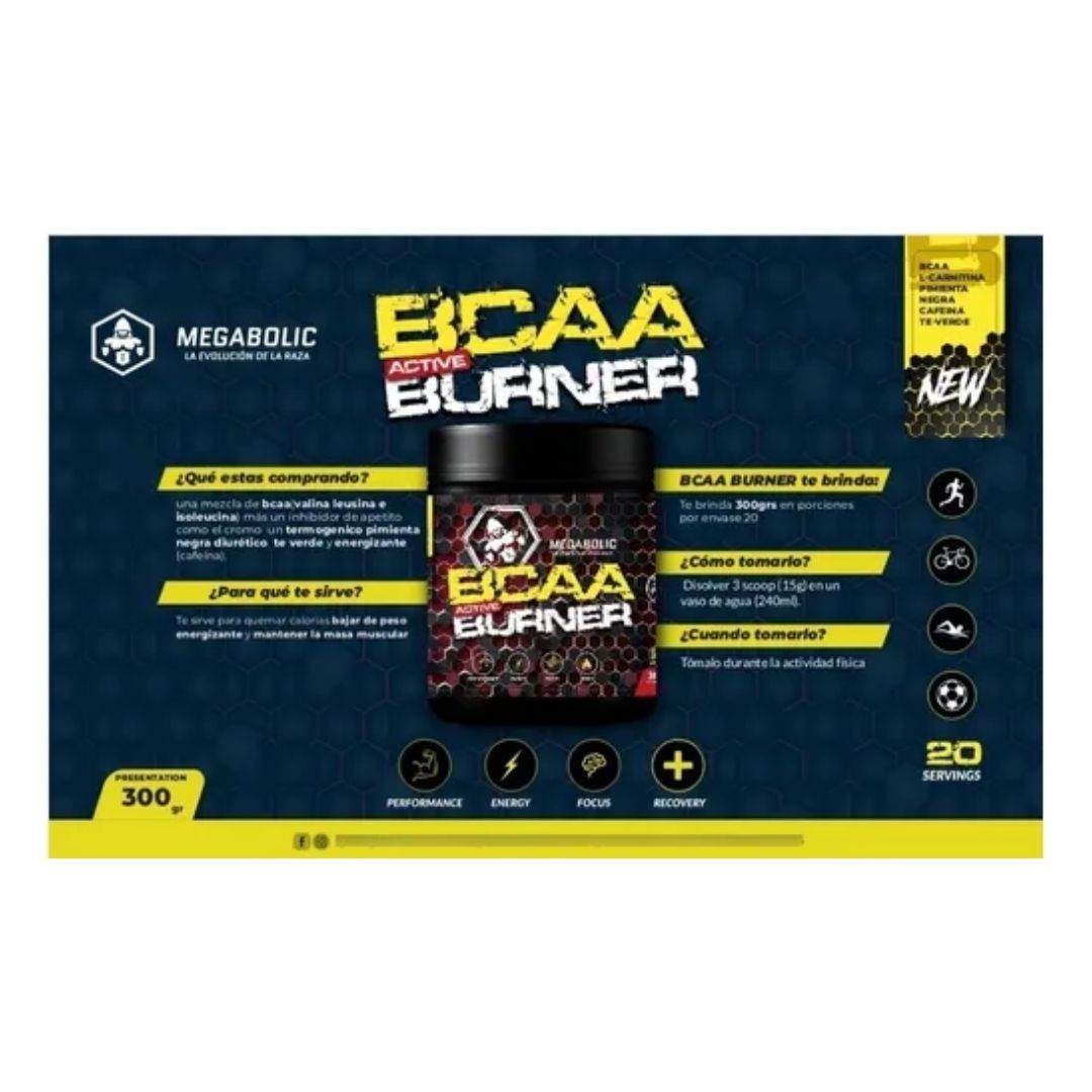 BCAA BURNER Es un conjunto de sustancias junto a aminoacidos que hacen que el metabolismo se acelere, se utilicen las grasas como energía, se disminuya el apetito, se evite la construcción de nuevo tejido adiposo, se aumente la síntesis de proteínas (masa magra), se aumente la vigilia, se mantenga la glucosa estable y por consiguiente exista una pérdida de peso sostenible y real, o sea una disminución del porcentaje de grasa.