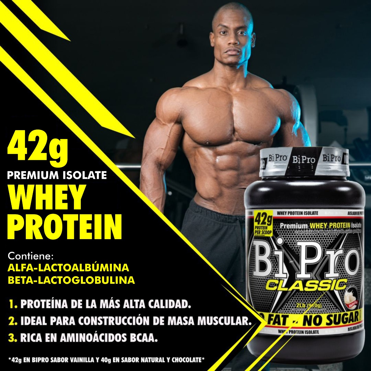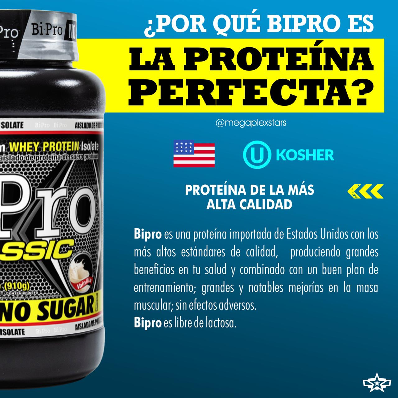 Bi-Pro Classic Aislado de proteína de suero, rico en aminoácidos de cadena ramificada leusina isoleucina y valina, los cuales suplen a los atletas con importantes nutrientes después del entrenamiento para fortalecer, construir y reparar sus músculos. Bi-Pro Classic es rápidamente absorbido, Bi-Pro Classic aporta 40g de proteína por servicio además cuenta con tres presentaciones chocolate, vainilla y natural.