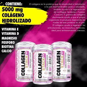 Collagen Stack Woman contiene un balance de ingredientes especialmente formulado para mujer: colágeno, vitamina E y biotina. Contiene junto al colágeno, calcio, fosforo y magnesio, los cuatros principales componentes del tejido óseo.