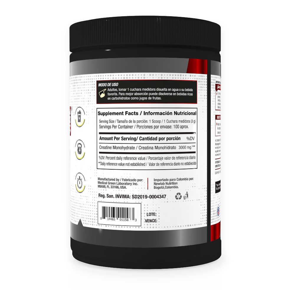 La creatina es una sustancia que se encuentra presente en el organismo de manera natural. Se sintetiza a partir de varios aminoácidos, que son componentes de las proteínas, por lo que la creatina tiene origen proteico. Es una Creatina monohidratada y micronizada. Cumple con análisis USP y HPLC, lo que garantiza la más alta calidad y pureza. Cada servicio contiene: