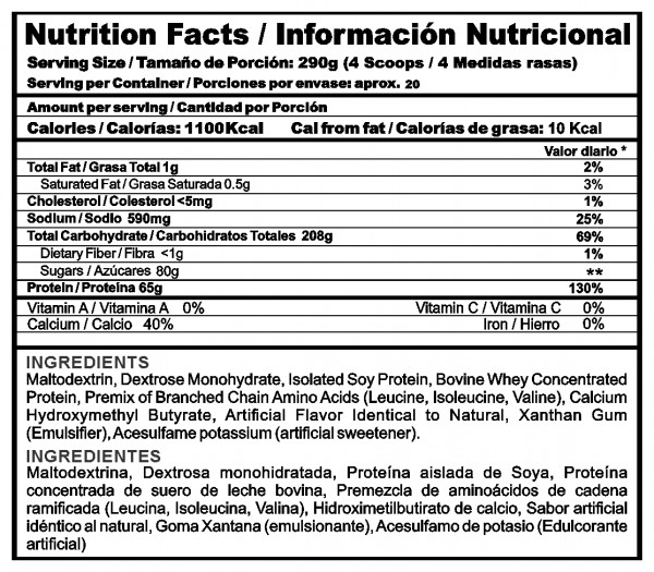 Gainz 1100 contiene 500 mg de HMB por servicio que combinado con el excelente perfil nutricional da como resultado un aumento extremo de masa muscular.