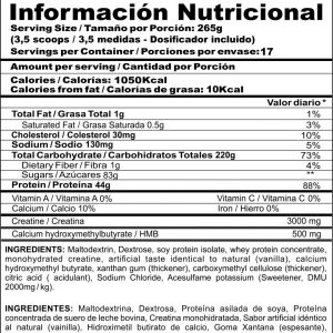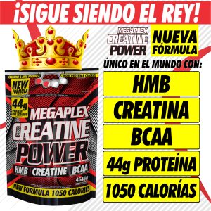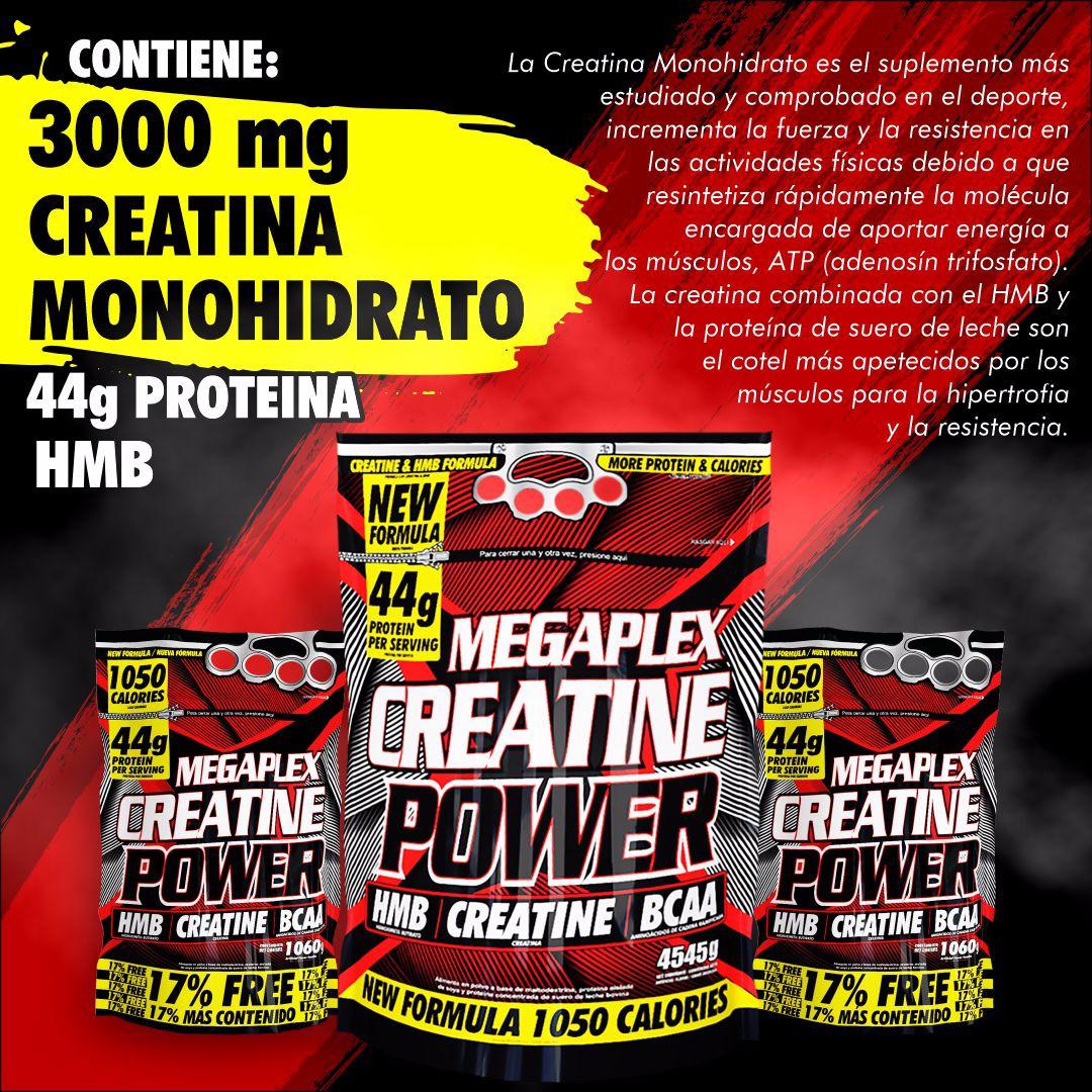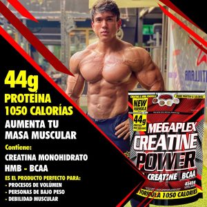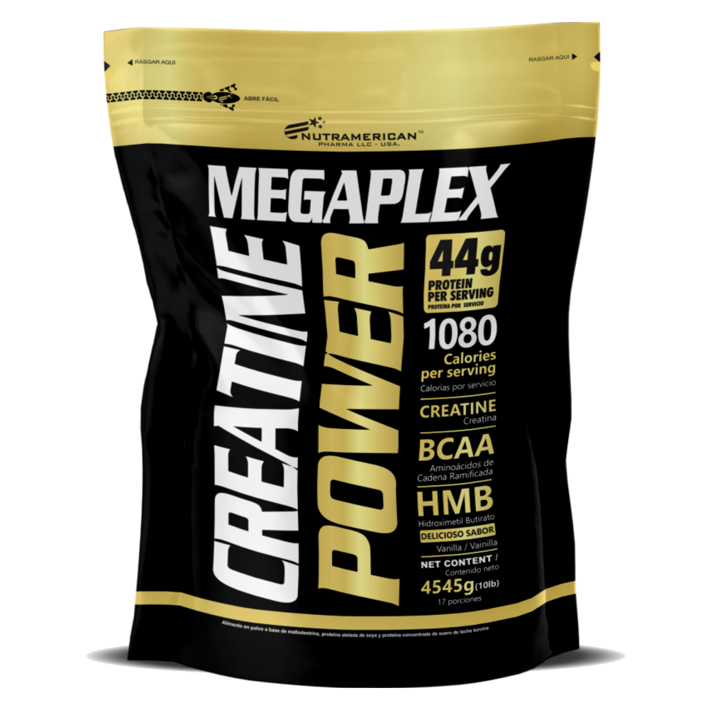 Megaplex Creatine Power sirve para aumentar masa muscular. Recomendado para personas que buscan incrementar su peso y fuerza, ganando masa muscular y volumen. Este producto contiene 44 gramos de proteína, 1050 calorías, 220 gramos de carbohidratos, 3 gramos de creatina, 500 mg de HMB y aminoácidos esenciales y no esenciales vitales para la construcción y mantenimiento de la masa muscular.