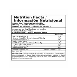 Contiene arveja como única fuente de proteína, con un valor biológico superior al de las carnes y al de la caseína. Como un valor agregado y buscando mejorar la utilización de las proteínas en el cuerpo, incluimos en NutraVegan Protein HMB, ingrediente con múltiples beneficios sobre la masa muscular.Contiene leche de coco en polvo con triglicéridos de cadena media (MCT), Cocoa y Café instantáneo para brindar el más delicioso sabor de proteína alguna.