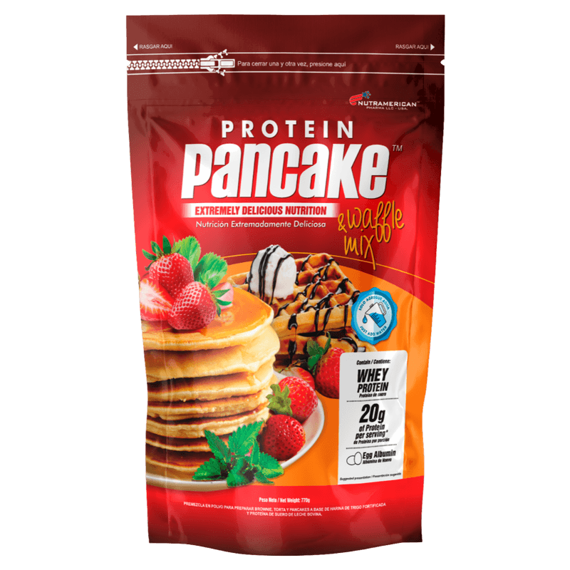 Protein Pancake, es una mezcla para preparar deliciosos pancakes y waffles con alto aporte de proteínas, para personas que desean tener una buena nutrición basada en un consumo apropiado de nutrientes, todo gracias a su avanzada y deliciosa formula. Protein Pancake aporta 20 g de proteína por servicio.